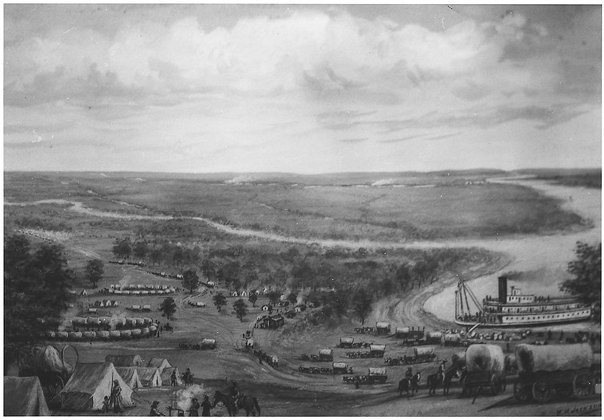The park, two blocks from our headquarters in the Harris-Kearney House, features the heroic-size bronze monument of Westport and Kansas City’s founding fathers Alexander Majors, John Calvin McCoy, and James Bridger. Pioneer Park, is located at the historic intersection of Santa Fe, Oregon Trails and California Trails which are commemorated on a large terrazzo map.
